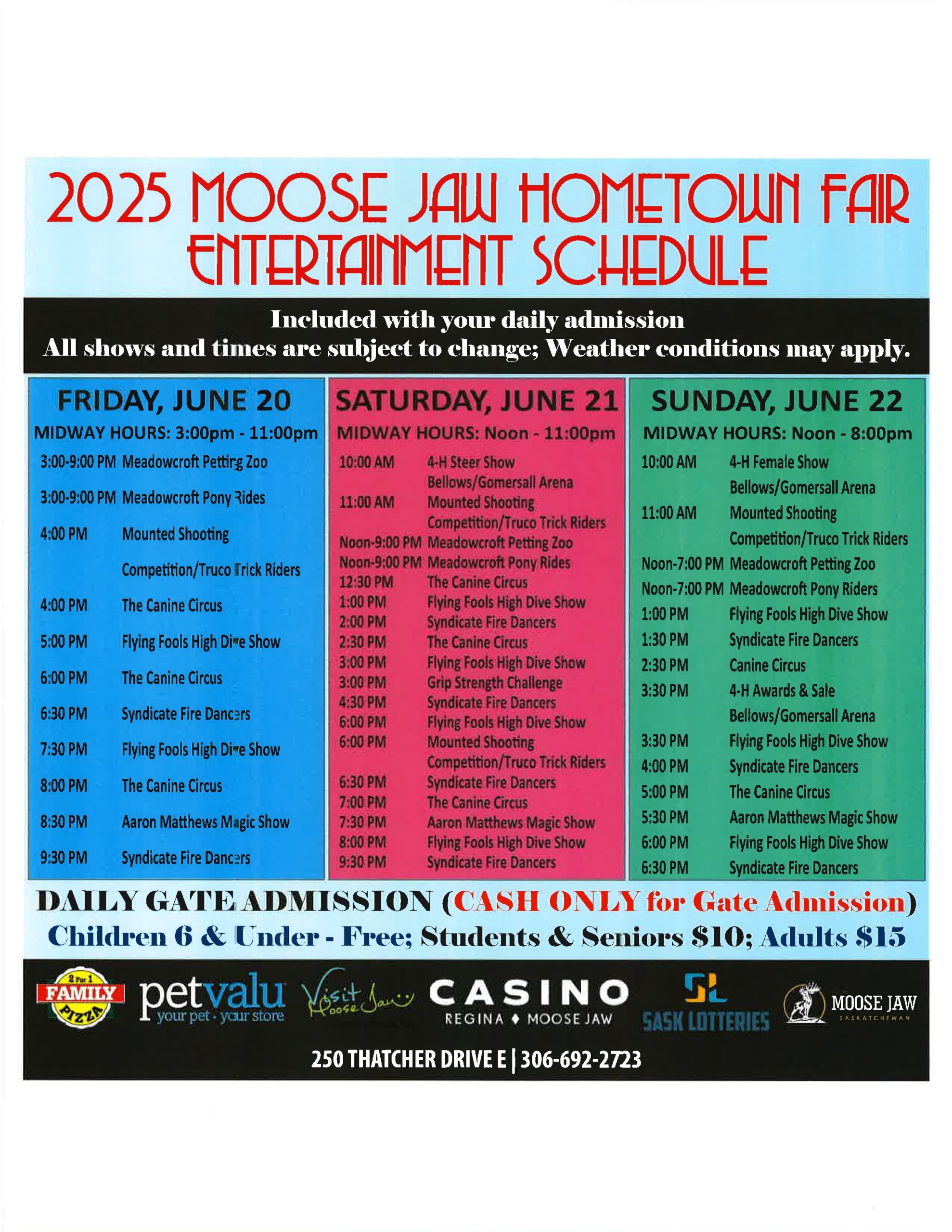 2025 Moose Jaw Hometown Fair Daily Entertainment Schedule